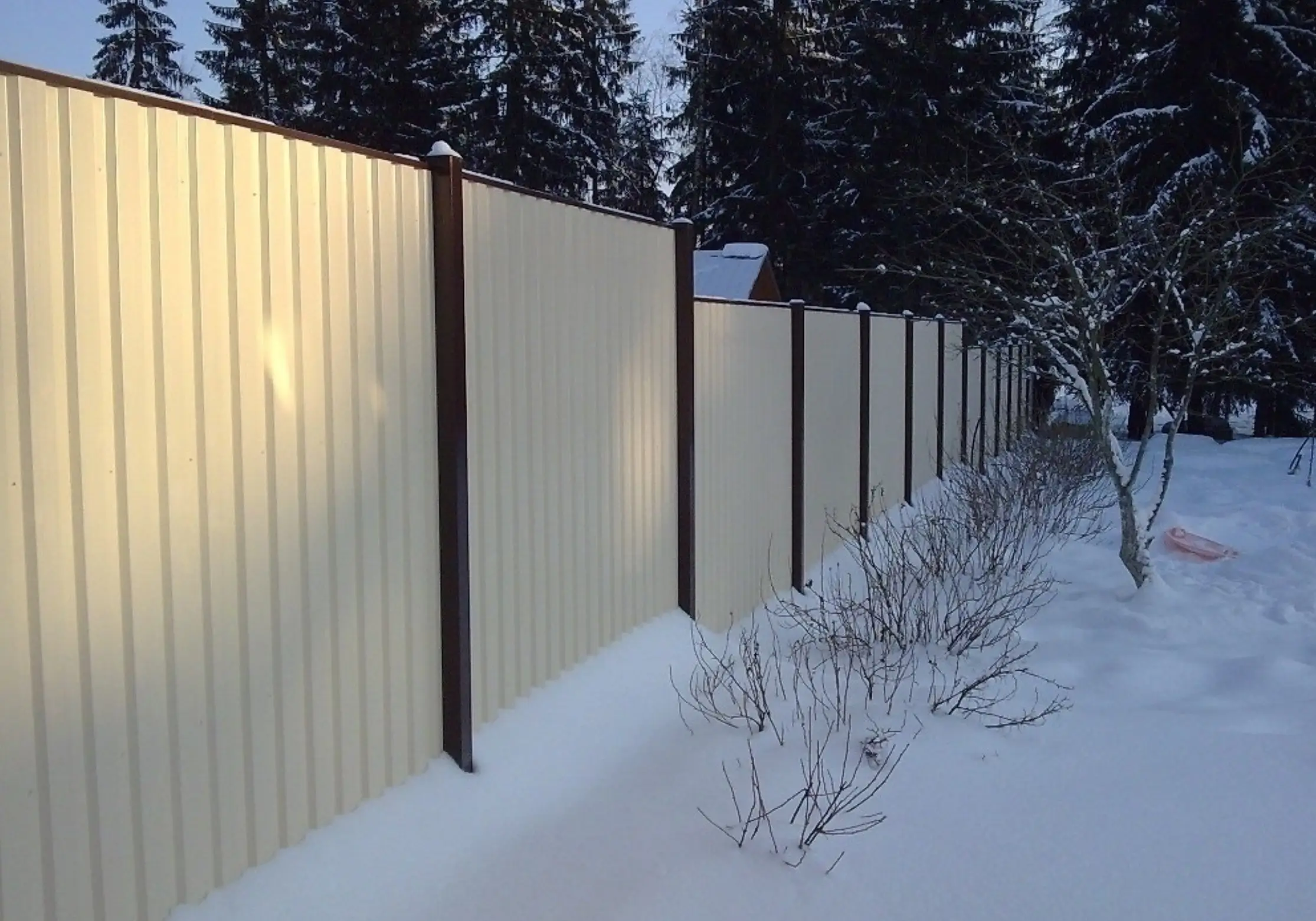 Профнастил для забора-это идеальный вариант для тех, кто хочет недорого и красиво оградить свою территорию от соседей))) ну и других посторонних заодно. Брали металл-профиль, материал прочный, не требует ухода и отлично справляется со своими задачами.