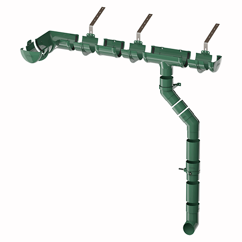 В состав системы входят все необходимые доборные элементы для организации полноценного отведения дождевой и талой воды с крыш и навесов.